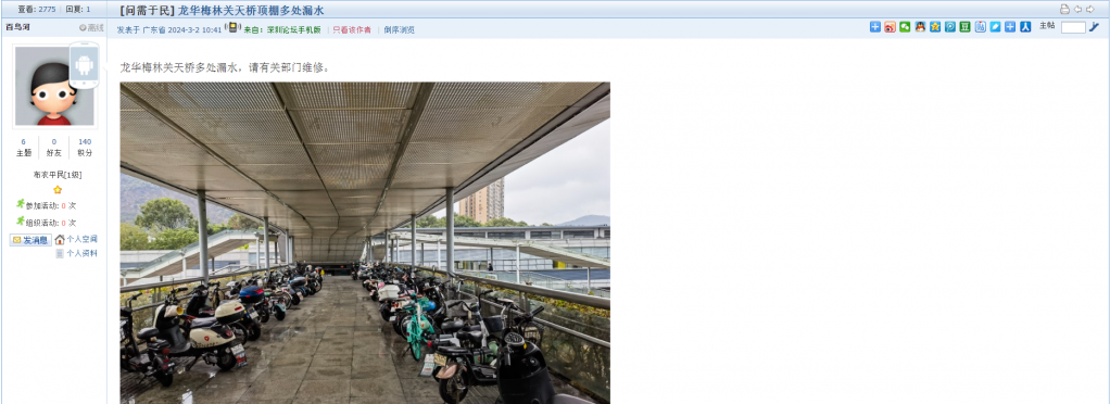 10、帖文《龙华梅林关天桥顶棚多处漏水》
