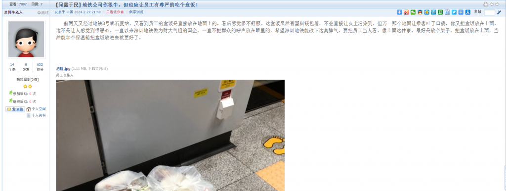 1、帖文《地铁公司你很牛,但也应让员工有尊严的吃个盒饭!》