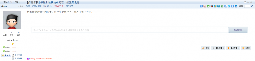 2、帖文《侨城北地铁站中间连个坐凳都没有》