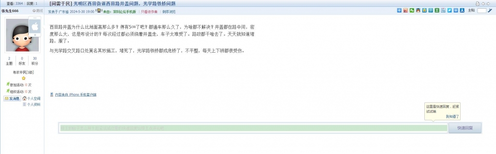 8、帖文《光明区西田街道西田路井盖问题,光学路铁桥问题》