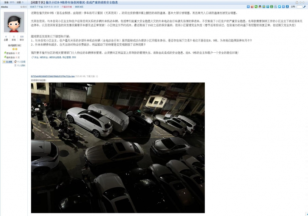 9、帖文《愉天小区8-9栋停车场夜间情况-造成严重的消防安全隐患》