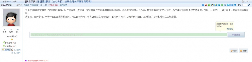 10、帖文《深圳蓝X教育(文心分校)违规在周末开展学科培训!》