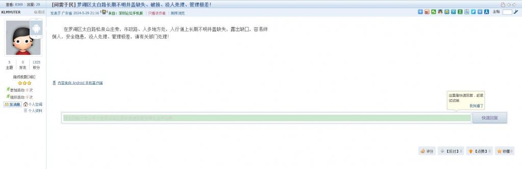 7、帖文《罗湖区太白路长期不明井盖缺失、破损、没人处理、管理极差!》