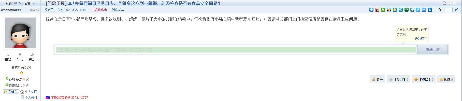 3、帖文《真*夫餐厅福田区景田店,早餐多次吃到小蟑螂,能否检查是否有食品安全问题?》