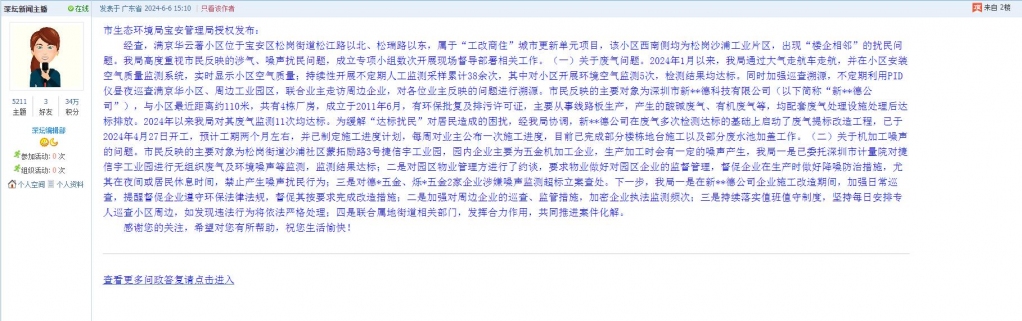 经查,满京华云著小区位于宝安区松岗街道松江路以北、松瑞路以东,属于“工改商住”城市更新单元项目,该小区西南侧均为松岗沙浦工业片区,出现“楼企相邻”的扰民问题。我局高度重视市民反映的涉气、噪声扰民问题,成立专项小组数次开展现场督导部署相关工作。(一)关于废气问题。2024年1月以来,我局通过大气走航车走航,并在小区安装空气质量监测系统,实时显示小区空气质量;持续性开展不定期人工监测采样累计38余次,其中对小区开展环境空气监测5次,检测结果均达标。同时加强巡查溯源,不定期利用PID仪昼夜巡查满京华小区、周边工业园区,联合业主走访周边企业,对各位业主反映的问题进行溯源。市民反映的主要对象为深圳市新**德科技有限公司(以下简称“新**德公司”),与小区最近距离约110米,共有4栋厂房,成立于2011年6月,有环保批复及排污许可证,主要从事线路板生产,产生的酸碱废气、有机废气等,均配套废气处理设施处理后达标排放。2024年以来我局对其废气监测11次均达标。为缓解“达标扰民”对居民造成的困扰,经我局协调,新**德公司在废气多次检测达标的基础上启动了废气提标改造工程,已于2024年4月27日开工,预计工期两个月左右,并已制定施工进度计划,每周对业主公布一次施工进度,目前已完成部分楼栋地台施工以及部分废水池加盖工作。(二)关于机加工噪声的问题。市民反映的主要对象为松岗街道沙浦社区蒙拓励路3号捷信宇工业园,园内企业主要为五金机加工企业,生产加工时会有一定的噪声产生,我局一是已委托深圳市计量院对捷信宇工业园进行无组织废气及环境噪声等监测,监测结果达标;二是对园区物业管理方进行了约谈,要求物业做好对园区企业的监督管理,督促企业在生产时做好降噪防治措施,尤其在夜间或居民休息时间,禁止产生噪声扰民行为;三是对德*五金、烁*五金2家企业涉嫌噪声监测超标立案查处。下一步,我局一是在新**德公司企业施工改造期间,加强日常巡查,提醒督促企业遵守环保法律法规,督促其按要求完成改造措施;二是加强对周边企业的巡查、监管措施,加密企业执法监测频次;三是持续落实值班值守制度,坚持每日安排专人巡查小区周边,如发现违法行为将依法严格处理;四是联合属地街道相关部门,发挥合力作用,共同推进案件化解。