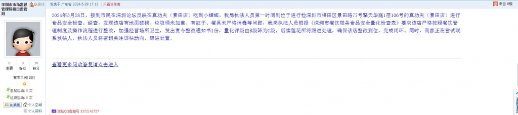 2024年5月28日,接到市民在深圳论坛反映在真功夫(景田店)吃到小蟑螂。我局执法人员第一时间到位于进行检深圳市福田区景田路77号擎天华庭1层106号的真功夫(景田店)进行食品安全检查。经查,发现该店有地面破损、垃圾桶未加盖、有蚊子、餐具未严格消毒等问题,我局执法人员根据《深圳市餐饮服务食品安全量化检查表》要求该店严格按照餐饮管理制度及操作流程进行整改,加强经营场所卫生,发出责令整改通知书1份,量化评级由B级降为C级。后续莲花所将跟进处理,确保该店整改到位,完成闭环。同时,商家正在尝试联系发帖人,执法人员将密切关注该帖动向,跟进处置。