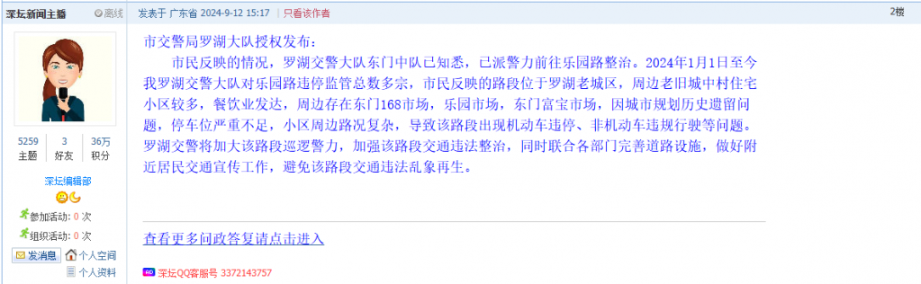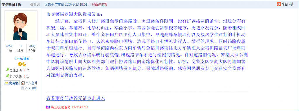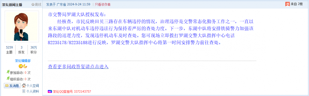 据统计,2024年9月9日-9月22日,网友在深圳论坛发布问政类帖文共78篇,得到相关单位正式回应的帖文数为58篇,市交警局罗湖大队和龙岗区布吉街道办事处回应速度最快。