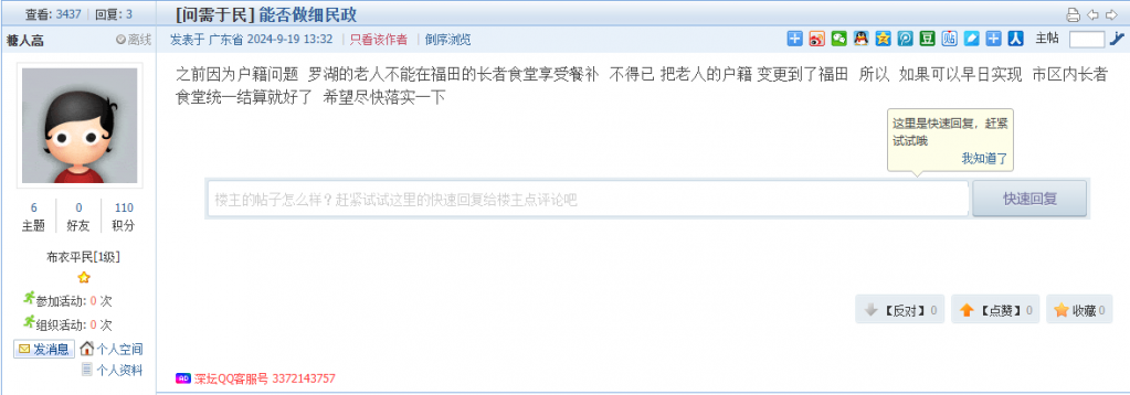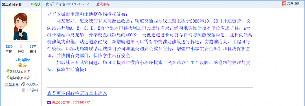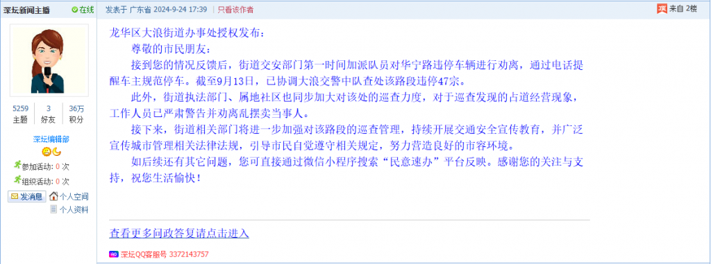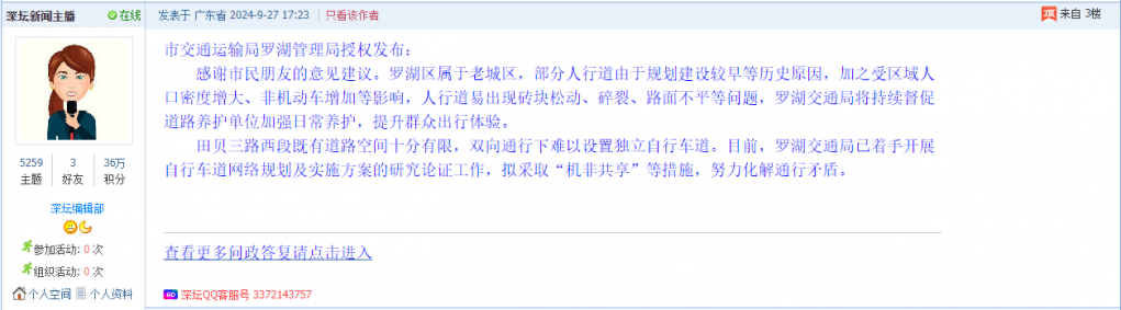 各职能单位如需对网友反映的问题进行回应,可在深圳论坛注册官方账号并通过认证,回帖进行回应。