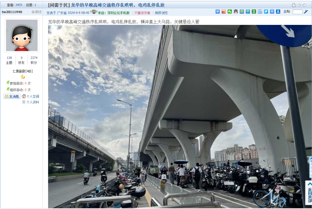 1. 帖文《龙华的早晚高峰交通秩序乱哄哄,电鸡乱停乱放》