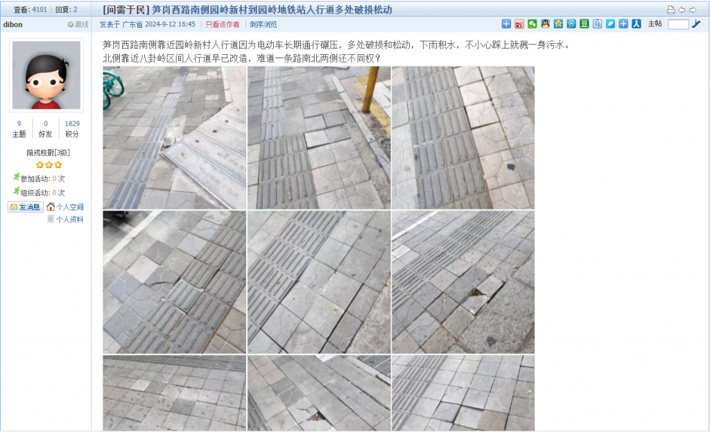 19. 帖文《笋岗西路南侧园岭新村到园岭地铁站人行道多处破损松动》