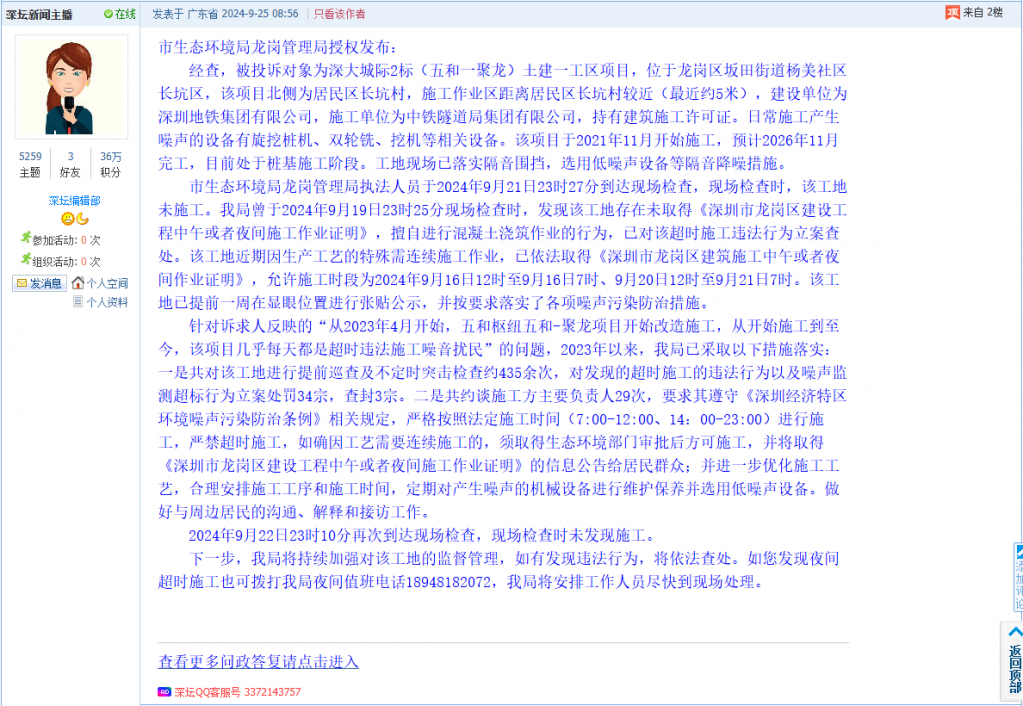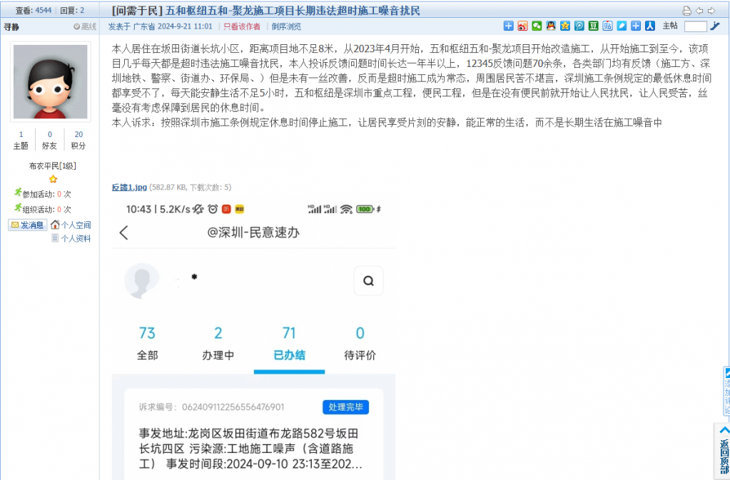 20. 帖文《坪山区盛波光电路段违规施工,噪音扰民》