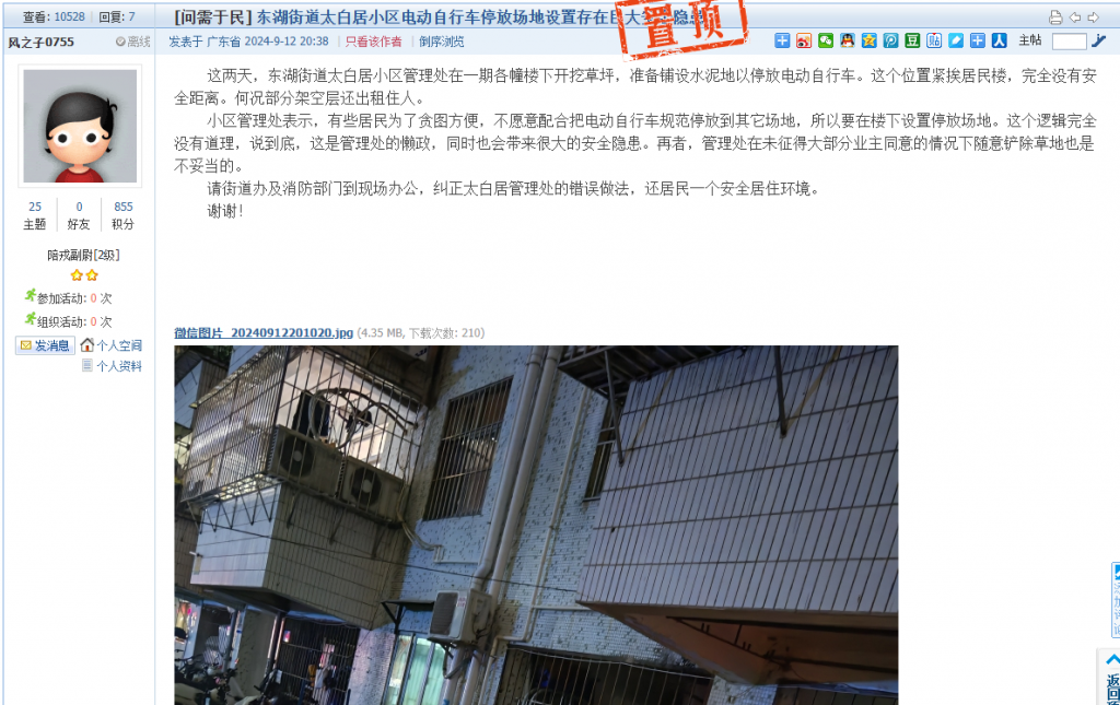 20. 帖文《东湖街道太白居小区电动自行车停放场地设置存在巨大安全隐患》