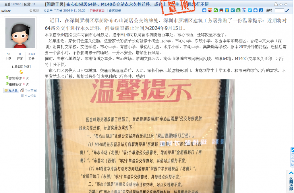 12. 帖文《布心山湖居64路、M140公交站点永久性迁移,或有上千学生、居民出行不便》