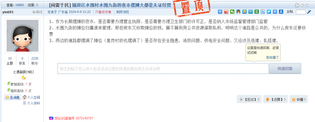 9. 帖文《福田区水围村水围九街的夜市摆摊大都是无证经营》