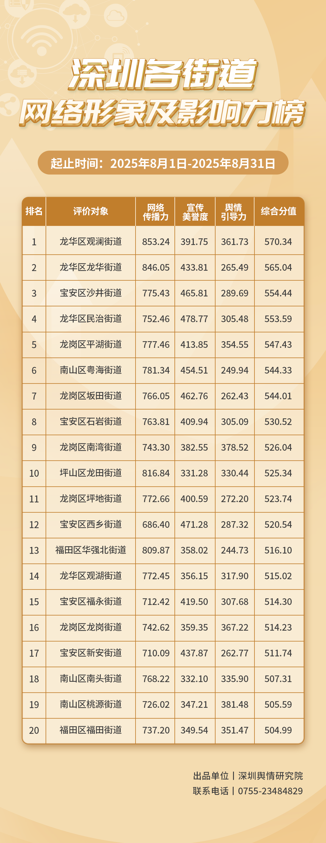 2025年8月,共有20个街道登上《深圳各街道网络形象及影响力榜》,分别是:龙华区观澜街道、龙华区龙华街道、宝安区沙井街道、龙华区民治街道、龙岗区平湖街道、南山区粤海街道、龙岗区坂田街道、宝安区石岩街道、龙岗区南湾街道、坪山区龙田街道、龙岗区坪地街道、宝安区西乡街道、福田区华强北街道、龙华区观湖街道、宝安区福永街道、龙岗区龙岗街道、宝安区新安街道、南山区南头街道、南山区桃源街道、福田区福田街道。