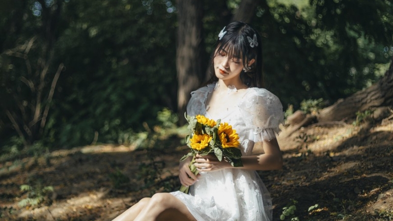 细雨中的白裙少女