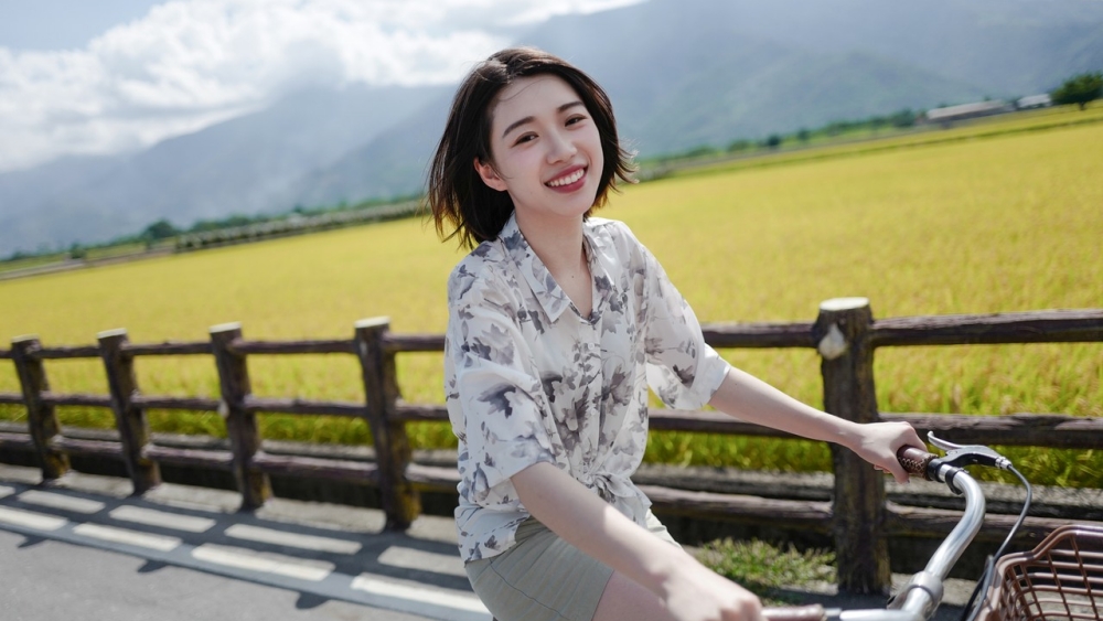 骑行在阳光下的麦田边