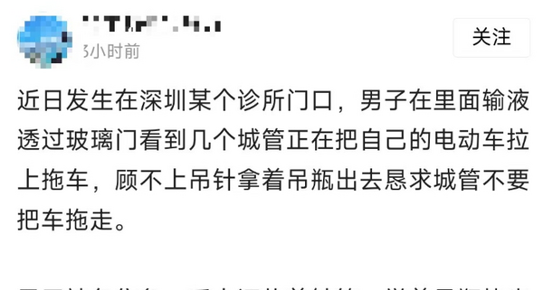 网传深圳一男子举着吊瓶阻止城管拉走电动车?消息不实!