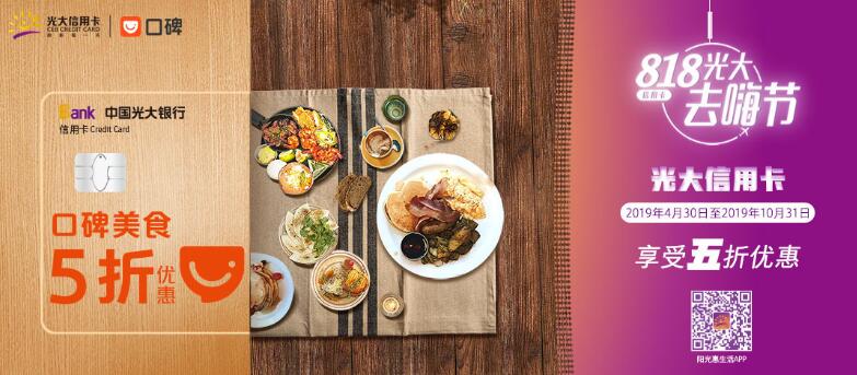 活动期间每周一至每周日,光大信用卡用户且在支付宝实名认证个人用户,在口碑平台美食行业商户处(休闲食品的商户除外),使用支付宝账户绑定的光大银行信用卡快捷支付进行当面付消费,有机会享受5折优惠,最高15元优惠封顶。活动期间每天限前8000个优惠名额,名额有限,用完即止。活动期间同一用户每月限享1次优惠机会。(详见阳光惠生活APP或口碑APP银行卡特惠频道,具体路径见活动细则)。