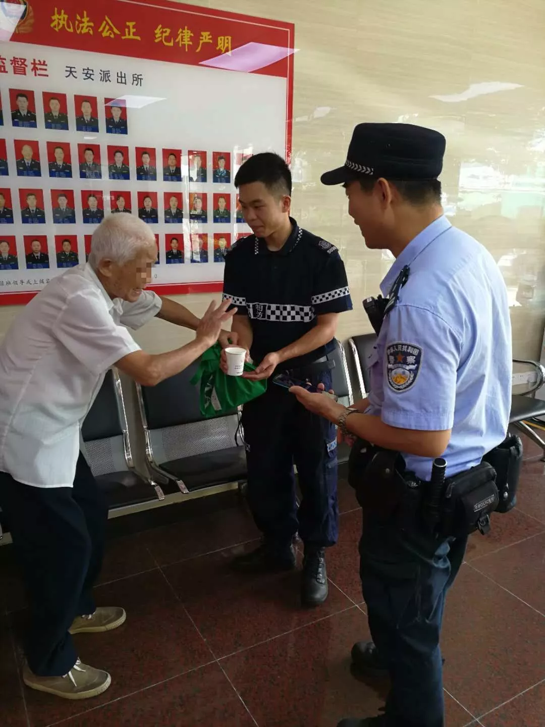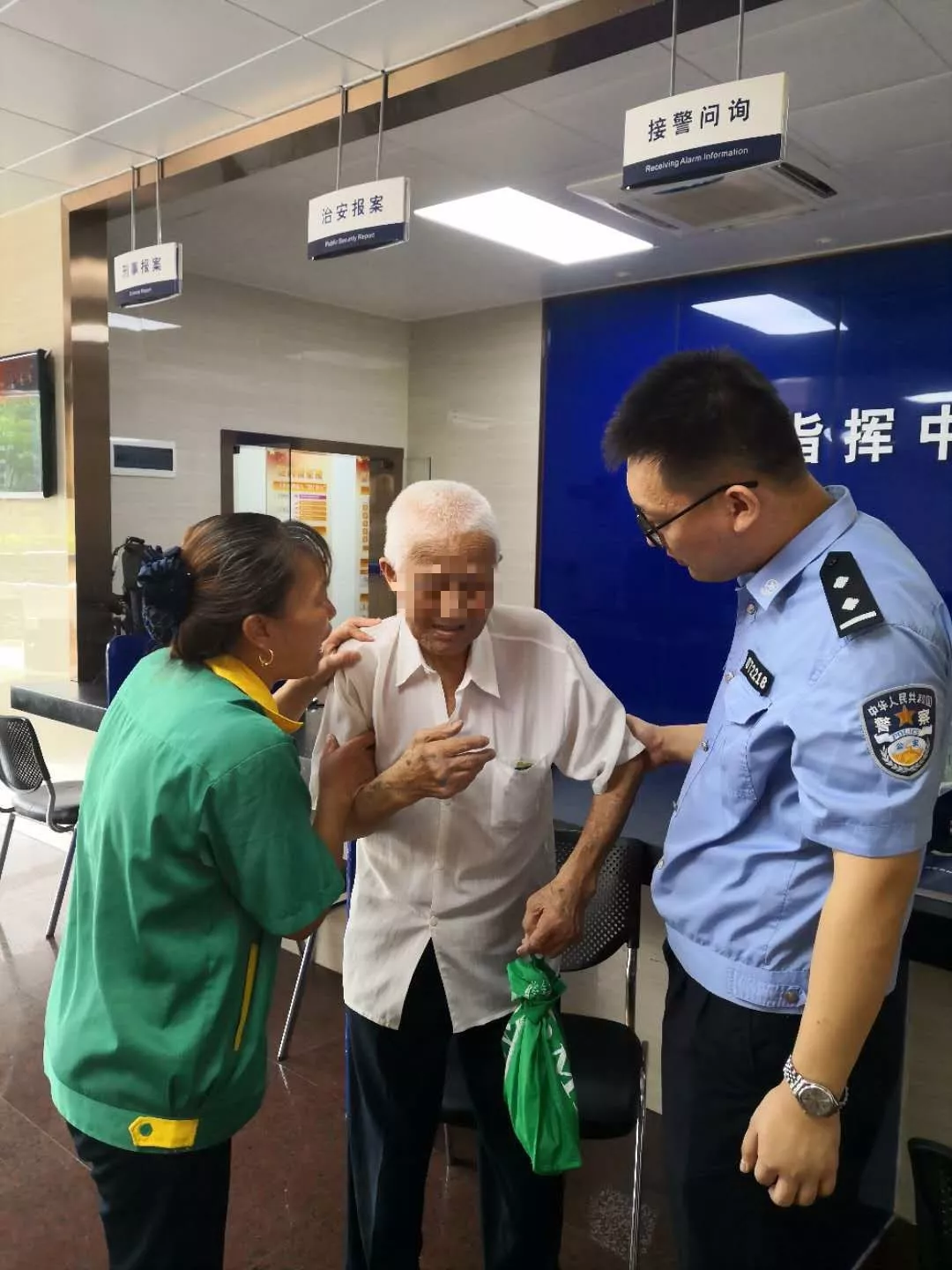 9月19日中午12时30分许,天安派出所巡防队员在福田汽车站警银亭值守时,发现一名疑似走失老人,巡防员上前询问情况后立即将情况上报值班室。巡逻民警邱志坚赶到现场,由于老人高龄,语言不通,无法获得更多有效信息,于是带回派出所进一步处理。
