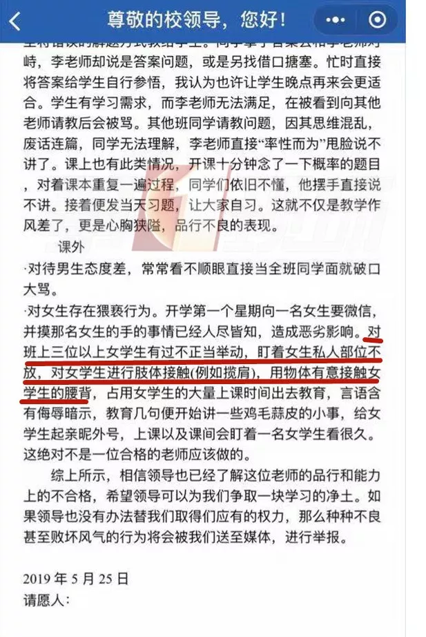 李先生向记者提供了一份,据称是学生写的联名信,关于这位老师的不当品行,其中写道“对班上三位以上女学生有过不正当举动,盯着女生私人部位不放,对女学生进行肢体接触,例如揽肩,用物体有意接触女学生的腰背,给女生起亲昵外号”。