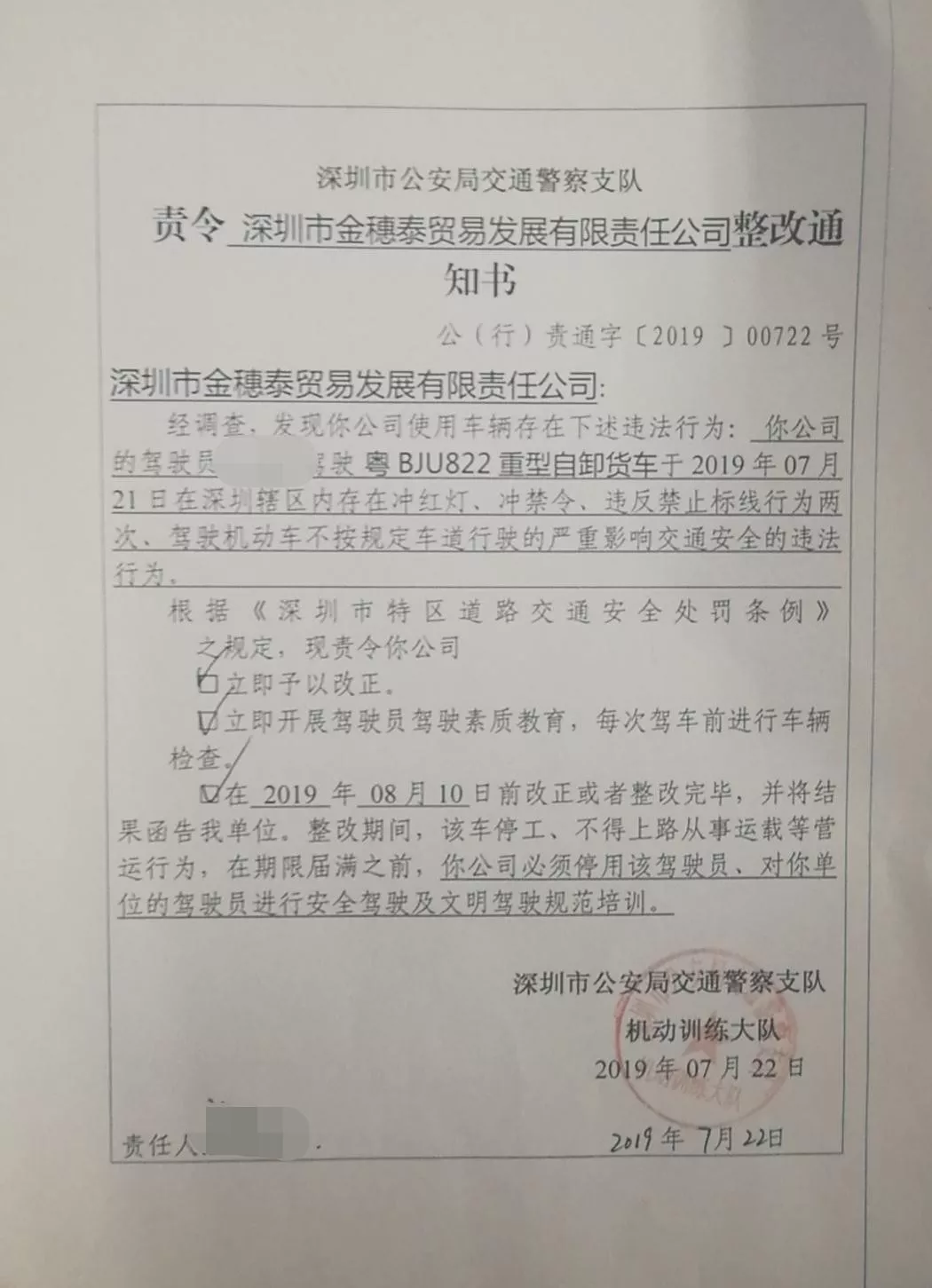 2019年7月21日,深圳交警接群众举报称,粤BJU822号泥头车存在妨碍交通安全驾驶的行为。