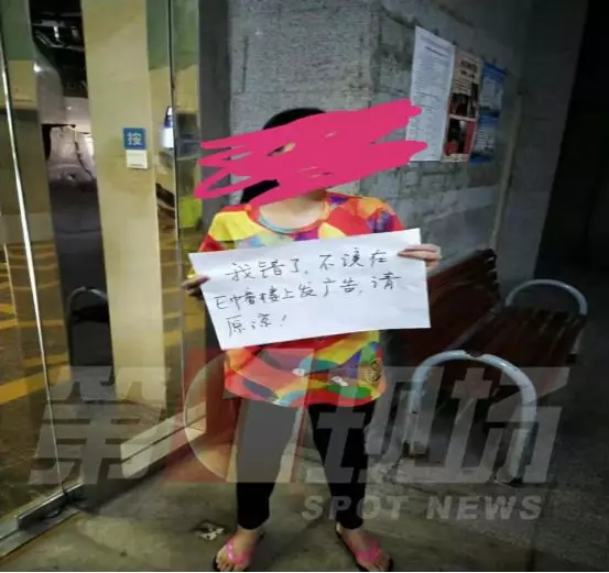 因为张贴的广告过多,处理起来繁琐且工作量很大,该名女子最后自己选择了对业主和住户们进行举牌道歉。