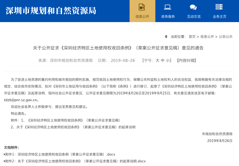 据了解,目前该《条例》(草案公开征求意见稿)正向社会公开征求意见,公开征求意见期限为2019年8月26日至2019年9月25日,有关意见请发送至电子邮箱:tdzb@pnr.sz.gov.cn。