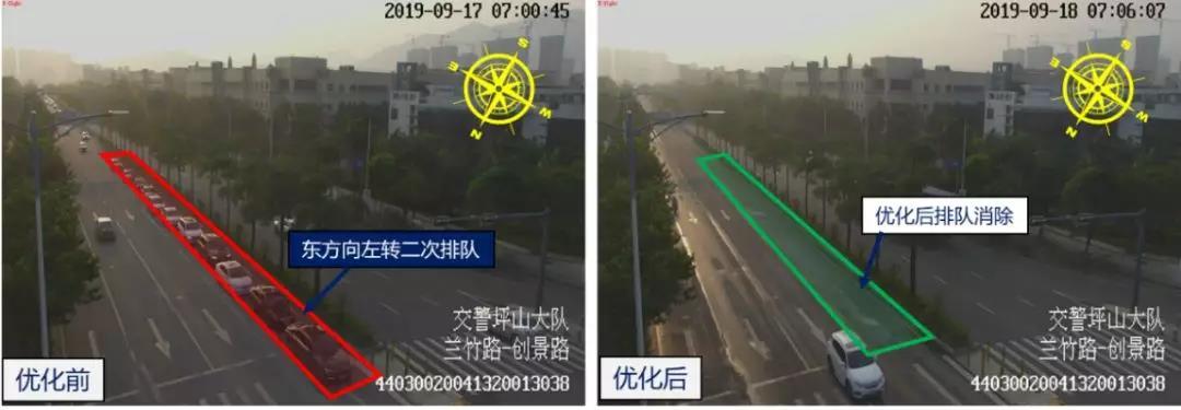 为解决该时段拥堵情况,交警优化调整该路口早高峰时段红绿灯,将早高峰时段由7时30分提前至6时50分,同时增加东方向左转绿灯时间20秒,以满足车流通过需求。优化后东方向左转二次排队情况消除,东方向左转车通行量由原144pcu/h上升至196pcu/h,上升36.1%。