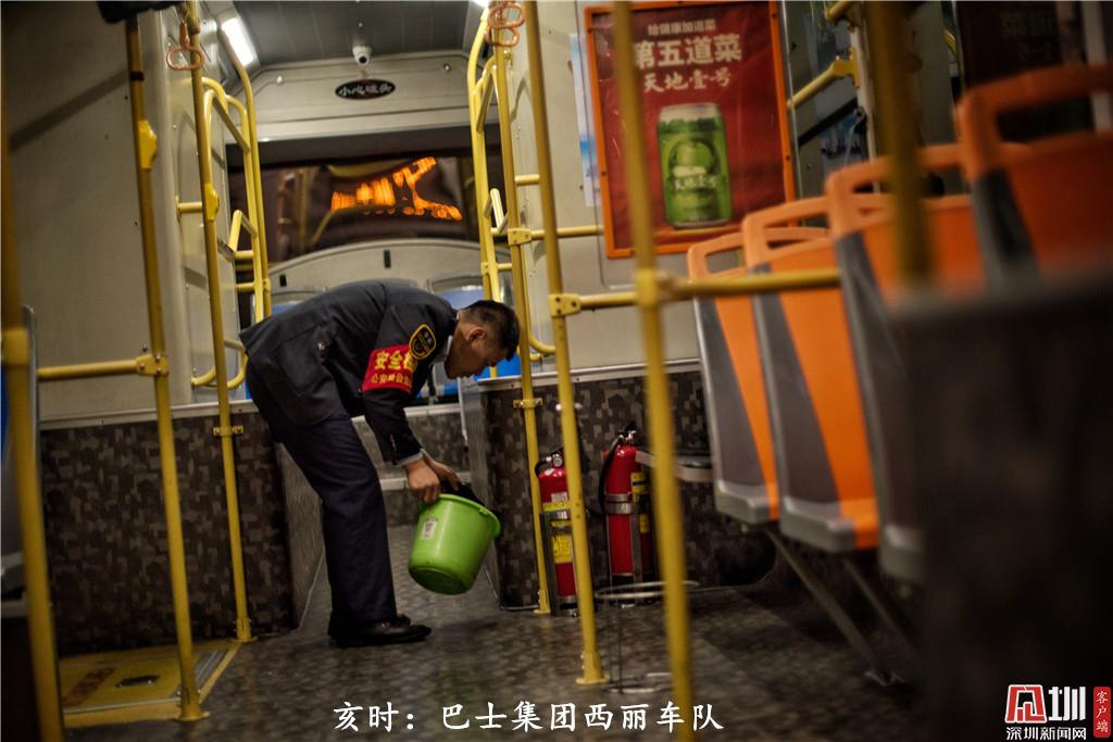 亥时:22点50分左右,深圳巴士集团四分公司西丽车队驾驶员张华林收班后,在给他的“老搭档”进行卫生清洁,第二天,他和他的搭档又将上路,为市民服务。