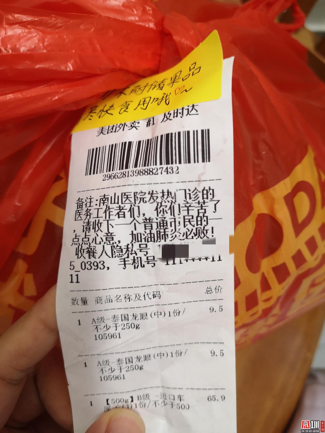 见圳客户端·深圳新闻网2020年2月1日讯 (见圳客户端、深圳新闻网记者 刘梦婷 通讯员 深协和)“老泪纵横!”1月30日晚上8点56分,华中科技大学协和深圳医院(南山医院)手外科护士王敏在朋友圈晒了一张照片,瞬时网友们纷纷点赞。照片里是一个红色塑料袋上贴着一张外卖单,备注上写着,“南山医院发热门诊的医务工作者们,你们辛苦了!请收下一个普通市民的一点点心意,加油,肺炎必败!”