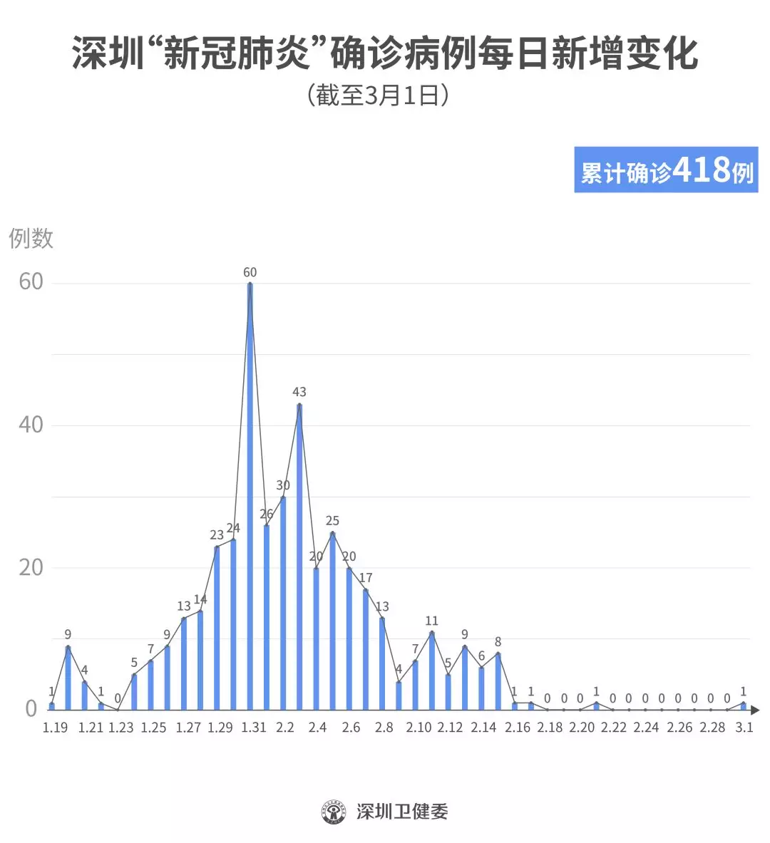 截至3月1日24时,深圳累计报告“新冠肺炎”确诊病例418例。3月1日当天全市新增确诊病例1例,当天出院病例12例(从2月26日起不再公布出院个案)。 ▲新增出院病例已超过新增确诊病例 累计报告确诊病例中,男性198例、女性220例。 按照病例管理地区划分,南山区87例、福田区82例、龙岗区71例、宝安区62例、龙华区34例、罗湖区32例、光明区11例、坪山区7例、盐田区6例、大鹏新区2例、其他(指由机场、车站、码头、关口、路卡等直接送往定点医院的)24例。 目前,重症6例、危重症2例,死亡3例,累计出院320例。 95例确诊病例均在深圳市第三人民医院隔离治疗。 103密切接触者正在接受医学观察。 资料来源:深圳市疾控中心、深圳市卫健委、广东省卫健委
