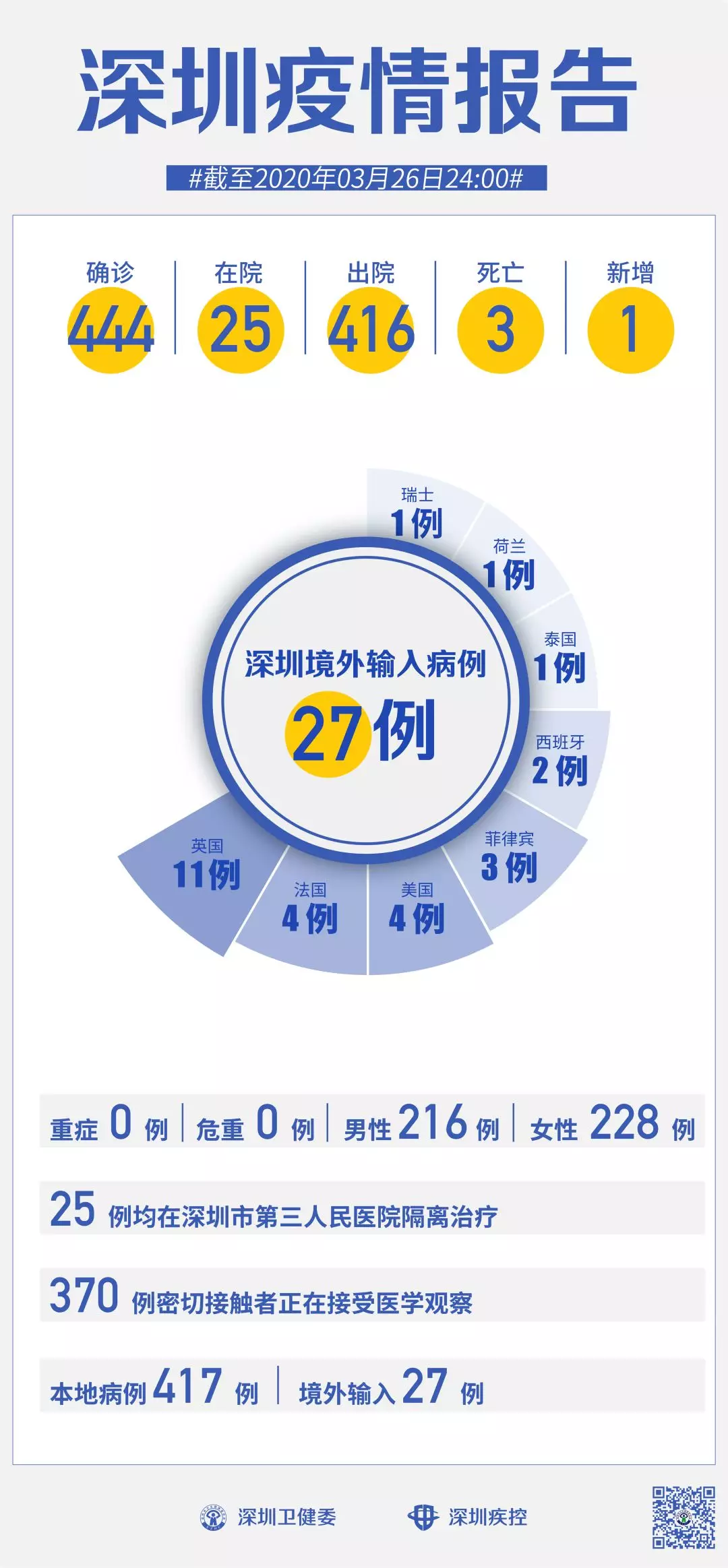 3月26日,深圳确诊1例境外输入“新冠肺炎”新病例,累计达27例。 截至3月26日24时,深圳累计报告“新冠肺炎”病例444例。3月26日当天新增1例,出院1例。 累计报告确诊病例中,男性216例、女性228例。 目前,死亡3例,累计出院416例。 25例确诊病例均在深圳市第三人民医院隔离治疗。 370名密切接触者正在接受医学观察。 来源:深圳市疾控中心、深圳市卫健委、广东省卫健委