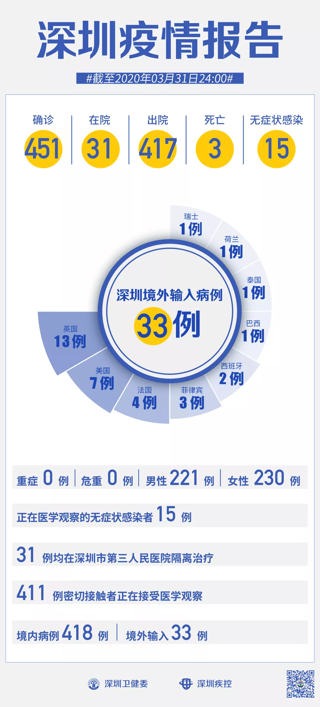 截至3月31日24时,深圳累计报告新冠肺炎病例451例。3月31日当天新增境内病例1例、无症状感染者1例。 【境内病例】:新增1例湖北返深确诊病例,出院1例,累计报告境内病例418例。 【境外输入】:当日无新增病例,累计报告境外输入病例33例。 【无症状感染者】:新增1例湖北返深无症状感染者。全市尚在医学观察的无症状感染者15例,其中境外输入9例。 累计报告确诊病例中,男性221例、女性230例。 目前,死亡3例,累计出院417例。31例确诊病例均在深圳市第三人民医院隔离治疗。 411名密切接触者正在接受医学观察。 无症状感染者7问7答 01.什么是新型冠状病毒无症状感染者? 新冠病毒无症状感染者(以下简称无症状感染者)是指无相关临床症状,如发热、咳嗽、咽痛等可自我感知或可临床识别的症状与体征,但呼吸道等标本新冠病毒病原学检测阳性者。无症状感染者可分为两种情形: 一是感染者核酸检测阳性,经过14天潜伏期的观察,均无任何可自我感知或可临床识别的症状与体征,始终为无症状感染状态; 二是感染者核酸检测阳性,采样时无任何可自我感知或可临床识别的症状与体征,但随后出现某种临床表现,即处于潜伏期的“无症状感染”状态。 02.无症状感染者有无传染性? 根据国家和部分省份开展的密切接触者监测数据,无症状感染者的密切接触者存在二代病例续发,流行病学调查中发现个别由无症状感染者导致的聚集性疫情,有小样本量的研究显示无症状感染者呼吸道样本中的病毒载量与确诊病例没有太大差异。 综合目前的监测和研究,无症状感染者存在传染性,但其传染期长短、传染性强弱、传播方式等尚需开展进一步科学研究。 部分专家认为鉴于无症状感染者的呼吸道标本能检出病原核酸,但由于无咳嗽、打喷嚏等临床症状,病原排出体外引起传播的机会较确诊病例相对少一些。 03.我国关于新型冠状病毒无症状感染者的防控要求是什么? 国家卫生健康委在1月28日发布《新冠病毒感染的肺炎防控方案》(第三版)中就将新型冠状病毒无症状感染者纳入防控管理,在其后的修订过程中均对无症状感染者的报告、管理等提出了明确具体的要求。各级各类医疗卫生机构发现无症状感染者,应于2小时内进行网络直报。 县(区)级疾控机构接到无症状感染者报告后,24小时内完成个案调查,并及时进行密切接触者登记,将个案调查表或调查报告及时通过传染病报告管理信息系统进行上报。 无症状感染者应集中隔离14天,原则上集中隔离满14天且两次连续标本核酸检测阴性者(采样时间至少间隔24小时)可解除隔离; 如果核酸检测仍为阳性者,则继续隔离医学观察。 隔离医学观察期间如出现临床表现,应及时转归为确诊病例,进行规范治疗。 无症状感染者密切接触者也要进行14天的集中隔离医学观察。 04.无症状感染者通过什么途径发现?截至目前我国发现了多少例无症状感染者? 目前我们主要通过以下途径主动发现无症状感染者: 一是对新型冠状病毒肺炎病例的密切接触者开展医学观察期间的主动检测; 二是在聚集性疫情调查中开展的主动检测; 三是在新型冠状病毒肺炎病例的传染源追踪过程中对暴露人群主动检测; 四是对部分有境内外新型冠状病毒肺炎病例持续传播地区的旅行史和居住史人员开展主动检测。 05.如何做好无症状感染者的风险评估及其防控? 无症状感染者存在着传播风险。 一是传播的隐匿性。由于无症状感染者无任何明显的症状与体征,其在人群中难以被发现,其导致的传播也难以预防。 二是症状的主观性。症状轻微或不典型者可能认为自己没有感染新冠病毒,不主动去医疗机构就诊,在日常的诊疗工作中难以被发现。 三是发现的局限性。由于存在检测窗口期,采用核酸检测和血清学检测方法难以发现全部无症状感染者,现有的无症状感染者主要是通过病例的密切接触者主动筛查、感染来源调查、聚集性疫情调查和对高风险地区人员的主动检测发现的,尚有部分无症状感染者难以被发现。 为此,要突出做好无症状感染者监测,有针对性加大筛查力度,将检测范围扩大至已发现病例和无症状感染者的密切接触者、重点地区和重点人群等。一旦发现无症状感染者,要立即按“四早”要求,严格集中隔离和医学观察,对密切接触者也要实施隔离医学观察。 由于部分无症状感染者始终无症状,实际防控工作中无法将发现和隔离无症状感染者作为主导措施。因此我们仍将继续着重于及时发现隔离确诊患者,并做好密切接触者管理。 我国经验表明,做好确诊病例的及时发现和隔离,并适度采取减少人际接触等措施,可以基本阻断疫情传播。 06.下一步如何做好无症状感染者防控管理? 一是完善防治方案。 抓紧在疫情重点地区抽取一定比例样本,开展无症状感染者调查和流行病学分析研究,完善防控措施,修订完善防控方案和诊疗方案,科学应对无症状感染者带来的感染风险,遏制可能形成新的疫情传播。 二是加大筛查监测。 有针对性加大筛查力度,将检测范围扩大至已发现病例和无症状感染者的密切接触者、重点地区和重点人群等。结合复工复产复学实际,加强对重点城市、重点人群、重点场所的监测,最大程度发现隐患。做好疫情跨境输入输出防范,对所有入境人员进行核酸检测。发现无症状感染者后,及时开展流行病学调查,查清来源,公开透明发布信