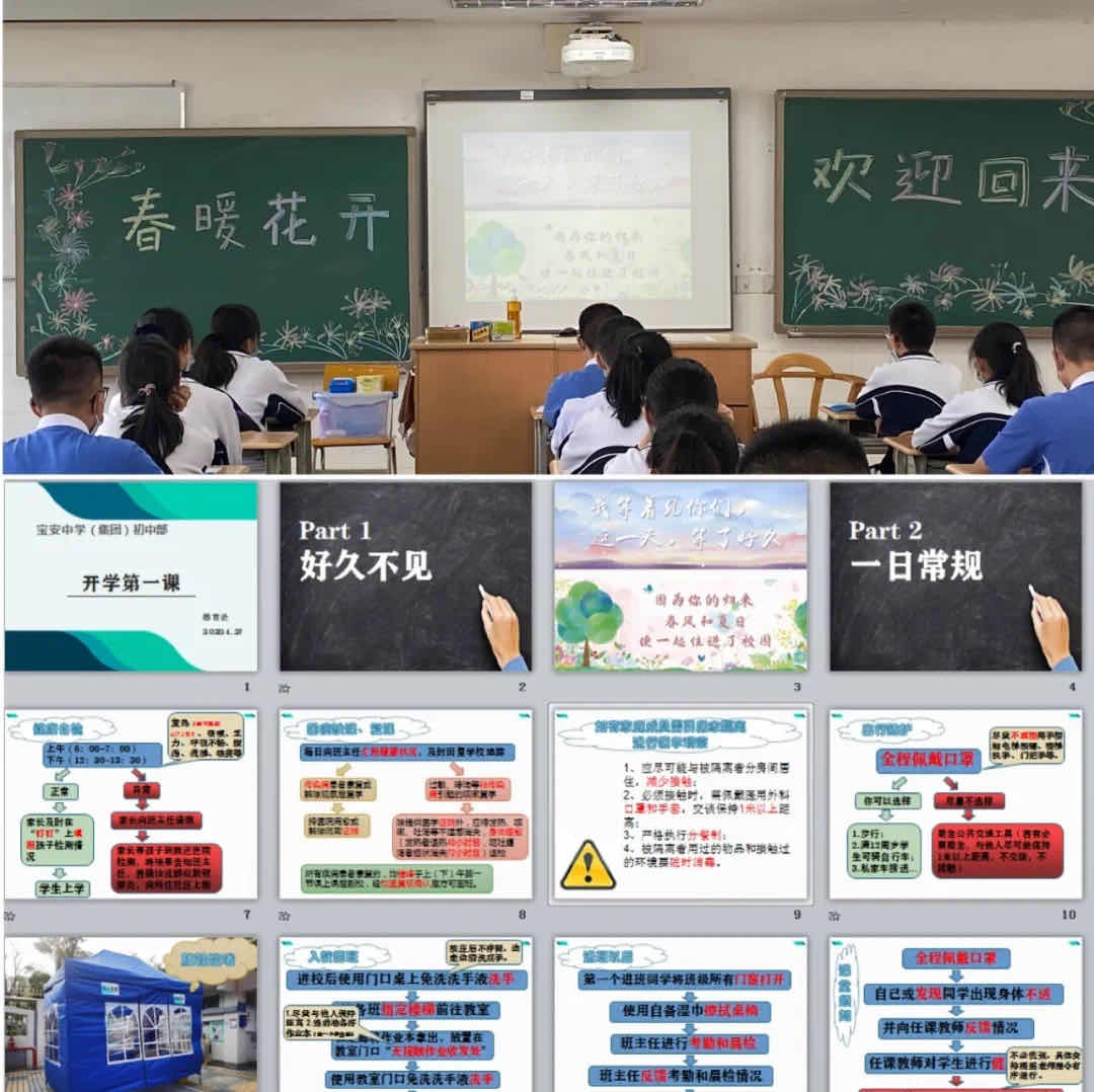 学校在校门外设立进入通道,让学生按照提前设置好的路线指引, 分批分流 进入校园。学校课室的课桌摆放呈“一人一桌”制,楼道贴上站位地标,充分拉开学生安全间距离, 少交谈少聚集 。除此之外,学校通过取消课间操、眼操等方式压缩课间,实现 错峰放学 。各班门前设置无接触交作业区,放置免洗洗手液,另外还特地为学生发放常规指引小册子,制作了《宝安中学(集团)2020年春季学期返校复学指引》手绘视频,开设了以防疫为主要内容的“开学第一课”,让防疫知识 入耳入脑入心 。