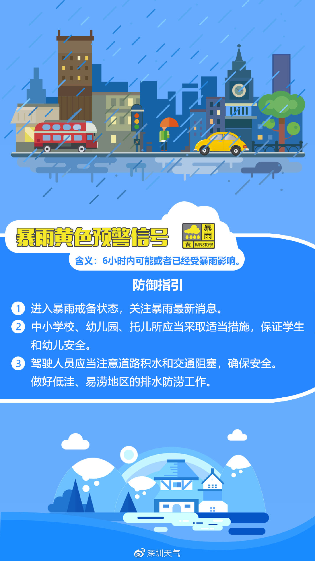 据深圳天气微博消息,过去1小时,大鹏新区和东部海区累计雨量已达暴雨,预计强降雨还将持续2-3小时,全市进入暴雨防御状态,请注意防御。中小学、幼儿园可视情况推迟上学。同时暴雨黄色分区、大风黄色、雷电预警正在生效中,请注意做好防御。