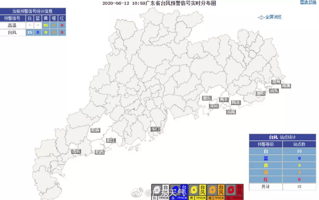 广东省气象局6月12日10时启动重大气象灾害(台风)三级应急响应。目前,广东沿海陆陆续续台风白色预警信号都在亮起,深圳在2020年6月12日12时发布台风白色预警。