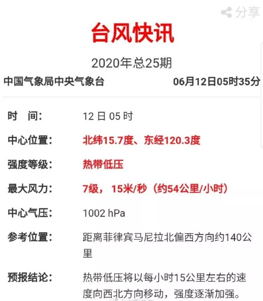 据@中央气象台,目前位于菲律宾吕宋岛西部热带低压即将移入南海东部海面,强度逐渐增强,12小时内将发展成为今年第2号台风鹦鹉,并将于14日白天在广东西部一带沿海登陆(23-28米/秒,热带风暴级或强热带风暴级),登陆后强度逐渐减弱。