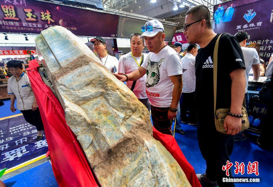 6月15日,第十一届新疆观赏石、和田玉精品博览会在位于新疆乌鲁木齐市红光山的新疆国际会展中心开幕,本次博览会参展种类涵盖珠宝、玉石、矿石、陨石、观赏石等,吸引众多奇石玩家到场“以石会友”,打造独具特色的“品石”盛宴。图为产自新疆阿勒泰地区富蕴县库玛拉山重量近1吨、价值1.5亿元人民币的海蓝宝原矿石。中新社记者刘新 摄