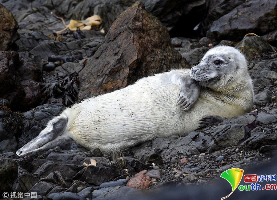 一只大西洋海豹幼崽躺在海边礁石上。