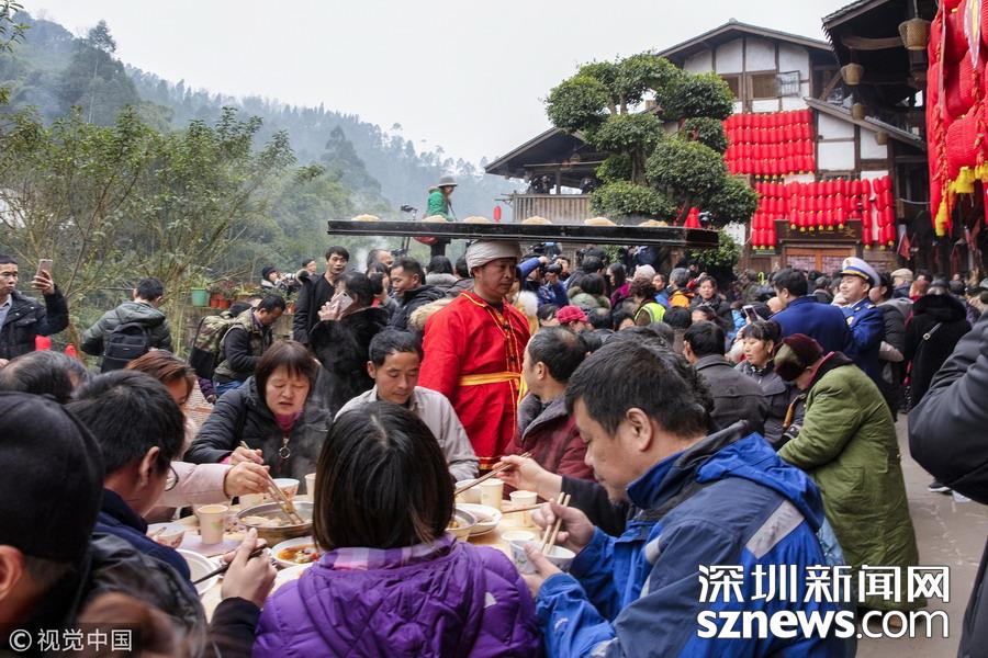 2019年1月26日,重庆中山古镇,880桌“千米长宴”5万人共品年味。身着红色对襟外套,光脚穿着草鞋的62岁老人杨光祥展示了他的绝活——“打盆上菜”。