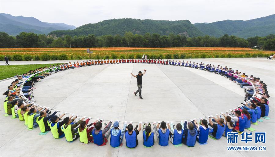 8月8日,游客在伊春市九峰山养心谷景区进行集体游戏活动。 时值八月,黑龙江省伊春市林区空气清新,凉爽宜人,吸引众多游客。 新华社记者李晓果摄