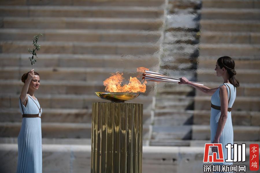 3月19日,扮演最高女祭司的希腊女演员桑西·乔治乌(右)从圣火盆中点燃火炬。