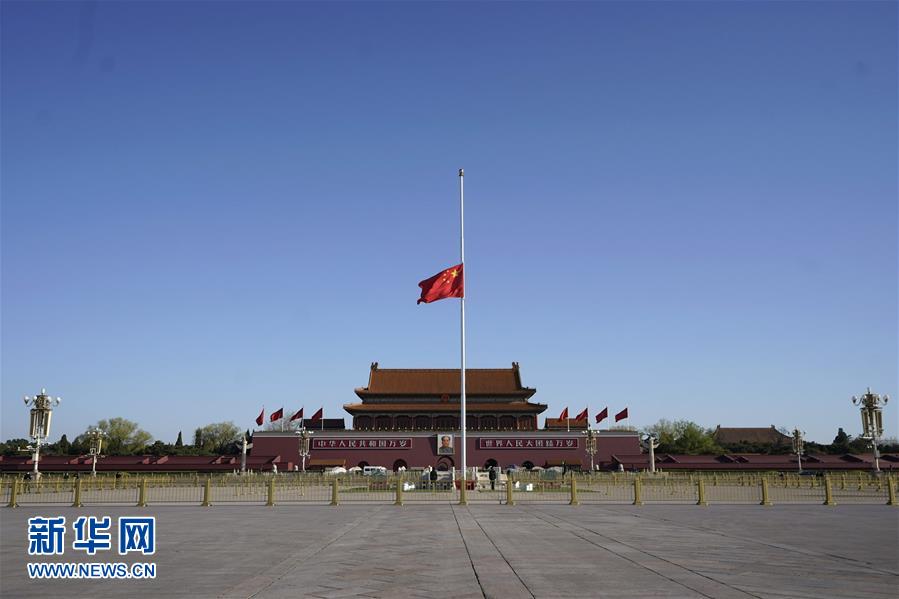 4月4日,北京天安门广场降下半旗,表达对抗击新冠肺炎疫情斗争牺牲烈士和逝世同胞的深切哀悼。新华社记者 彭子洋 摄