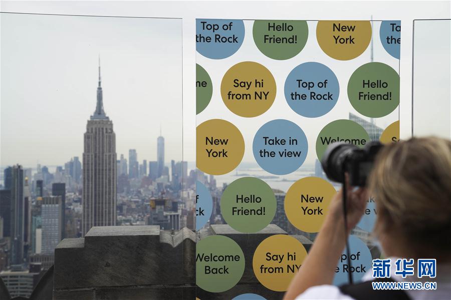 8月6日,在美国纽约,一名摄影师在洛克菲勒中心观景台上拍摄城市景观。当日,3月份暂时关闭的洛克菲勒中心观景台恢复对公众开放。每天13时至21时,人们可戴口罩前往参观。新华社记者王迎摄