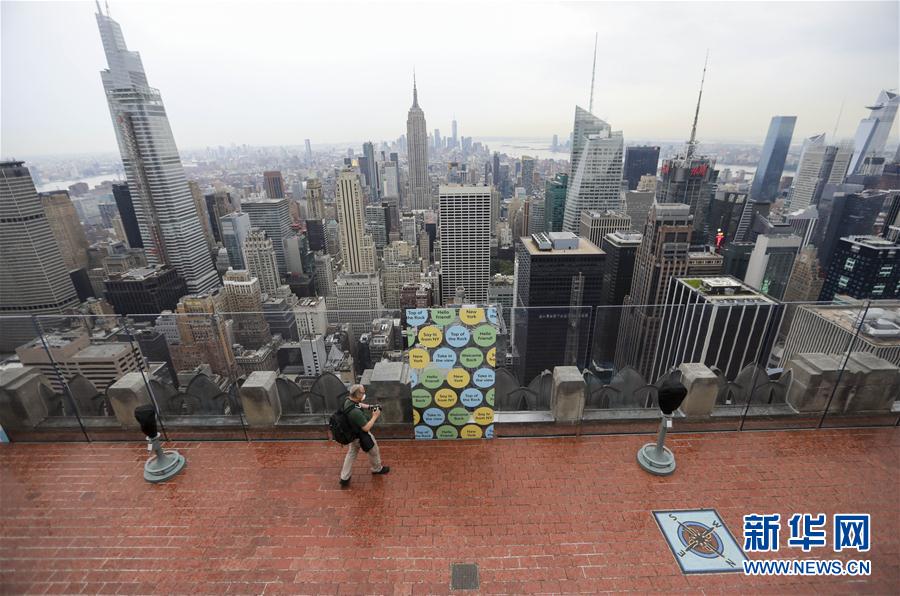8月6日,在美国纽约,一名摄影师在洛克菲勒中心观景台上参观。当日,3月份暂时关闭的洛克菲勒中心观景台恢复对公众开放。每天13时至21时,人们可戴口罩前往参观。新华社记者王迎摄