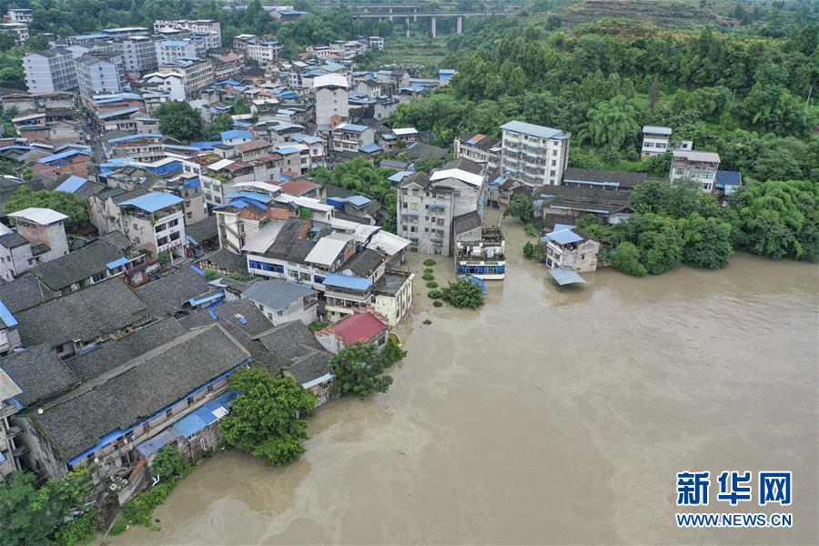 8月13日,在重庆市潼南区玉溪镇,涪江水位明显上涨,洪水倒灌进场镇(无人机照片)。受上游强降雨影响,嘉陵江近日出现明显涨水过程,“嘉陵江2020年第1号洪水”已在嘉陵江支流涪江形成。重庆市正式启动洪水防御Ⅱ级应急响应。据初步统计,截至13日16时30分,位于涪江畔的重庆市潼南区,沿涪江7个镇街不同程度受灾,受灾人数8209人,转移人口6658人,农作物受灾面积5579亩。新华社记者黄伟摄