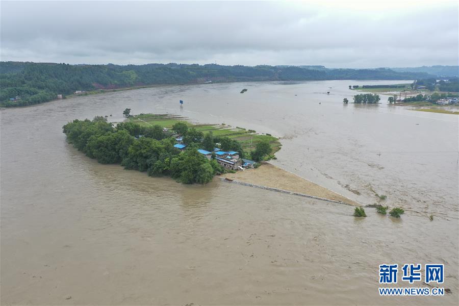 8月13日,在重庆市潼南区玉溪镇,涪江水位明显上涨(无人机照片)。受上游强降雨影响,嘉陵江近日出现明显涨水过程,“嘉陵江2020年第1号洪水”已在嘉陵江支流涪江形成。重庆市正式启动洪水防御Ⅱ级应急响应。据初步统计,截至13日16时30分,位于涪江畔的重庆市潼南区,沿涪江7个镇街不同程度受灾,受灾人数8209人,转移人口6658人,农作物受灾面积5579亩。新华社记者黄伟摄