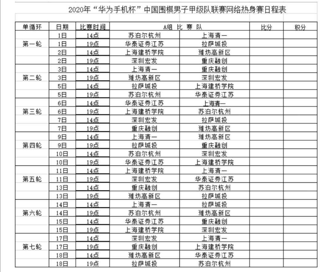 附:2020年“华为手机杯”中国围棋男子甲级队联赛网络热身赛日程表