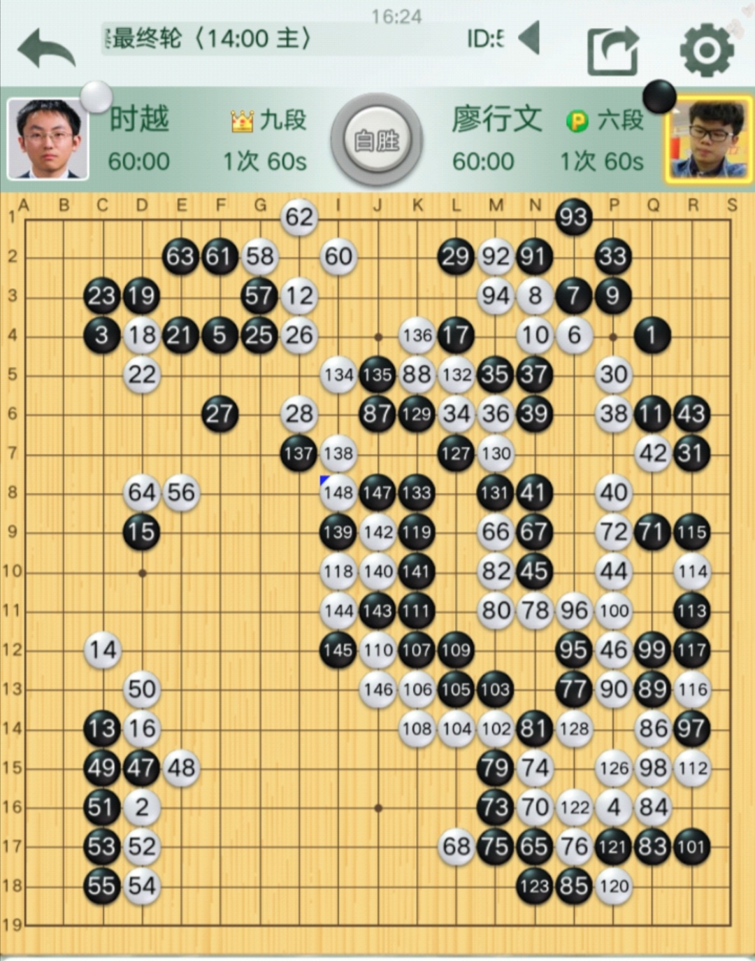 时越自评:序盘阶段正常,黑棋率先在上边打入挑起战斗,中盘黑棋判断失误,之后形成转换,白棋确立胜势。
